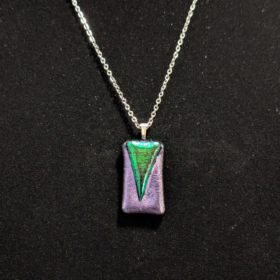 Introducing our stunning Dichroic Shine pendant, a unique and eye-catching piece of jewellery that will surely turn heads. Handmade with dichroic glass, this pendant features a mesmerizing shine that shifts and changes with every movement. The pendant comes with a sleek silver-plated chain and bail, adding a touch of elegance to this already exquisite piece. Make a statement and add a pop of color and shine to any outfit with our Dichroic Shine pendant.
